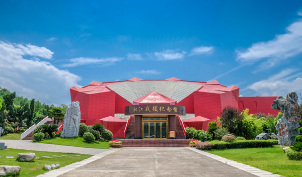 广西桂林,湘江战役纪念馆。湘江战役纪念馆位于纪念公园内的狮子山南侧山脚下,主体造型为硝烟下红军的八角帽,外墙体主基调为红色,体现当年中央红军浴血奋战、血染战场的悲壮历史。(图片来源:视觉中国)