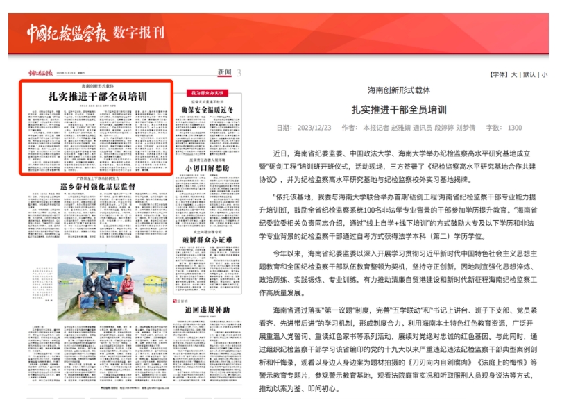 “依托该基地,我委与海南大学联合举办首期‘砺剑工程’海南省纪检监察干部专业能力提升培训班,鼓励全省纪检监察系统100名非法学专业背景的干部参加学历提升教育。”海南省纪委监委相关负责同志介绍,通过“线上自学+线下培训”的方式鼓励大专及以下学历和非法学专业背景的纪检监察干部通过自考方式获得法学本科(第二)学历学位。