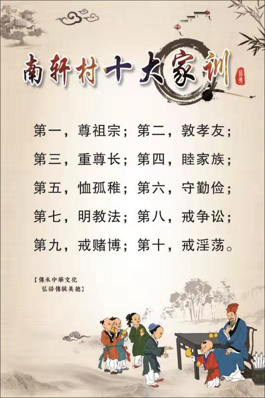 南轩村的人们始终谨遵“南轩村十大家训”,以王讷先祖为榜样,积极弘扬勤俭节约、诚实守信、孝老爱亲的社会美德,把良好的行为自觉落实到日常生活中,逐渐形成了以孝义为先、重教尚学、友善团结等为内涵的村风、民风。