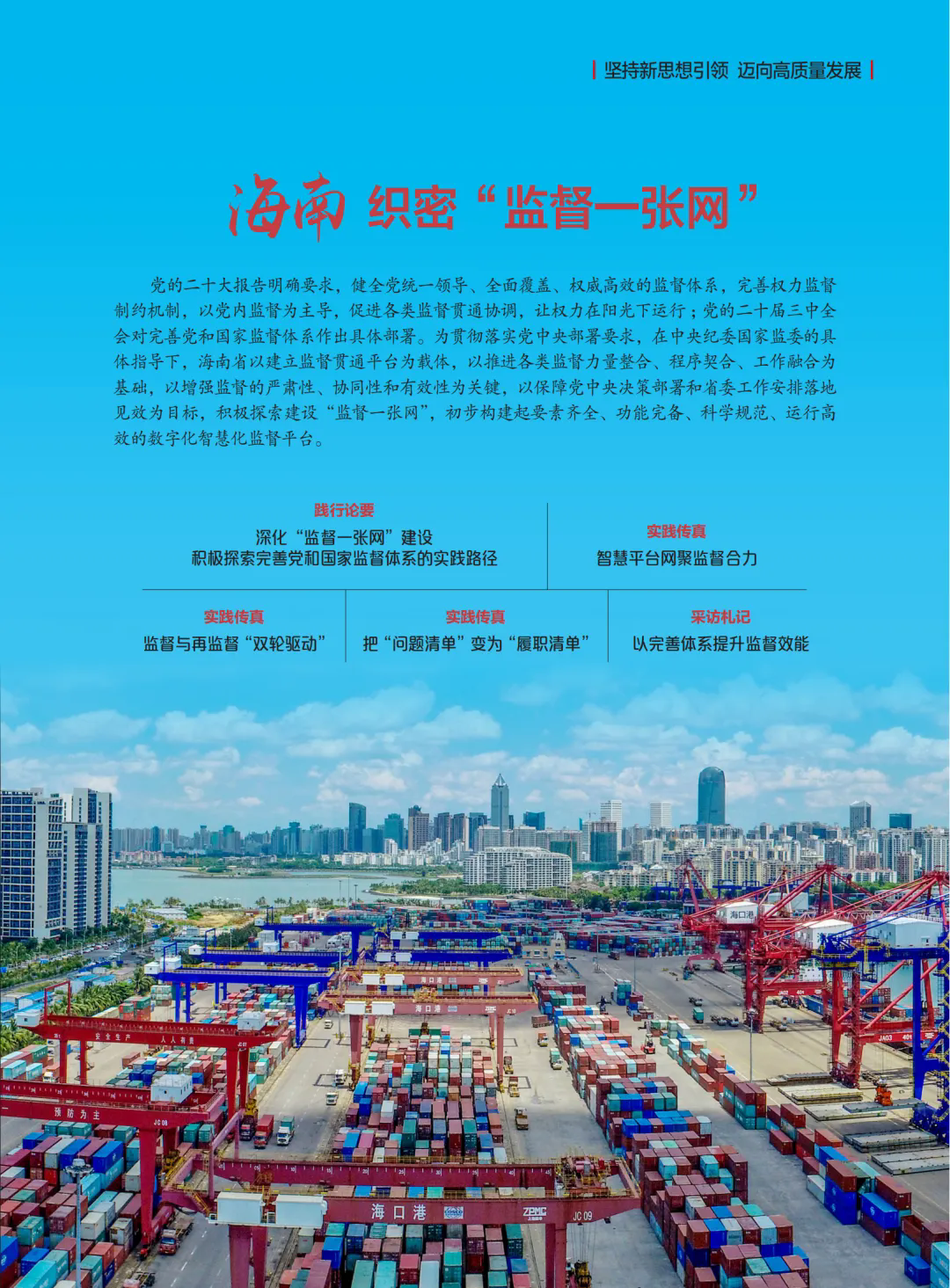 习近平总书记对海南自由贸易港建设作出重要指示强调,要把制度集成创新摆在突出位置。作为新一批自由贸易港建设制度集成创新案例之一,“监督一张网”平台从海南这片先行先试的热土破土而出、发芽生长,以机制创新和科技赋能,为推动监督协同高效探索了新路径。