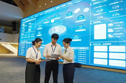 “监督一张网”把问题处置全流程搬到线上,实现对办件情况“一屏尽览”。图为 海口市纪检监察干部在市民游客中心了解“监督一张网”运行情况。吉曼妮 / 摄