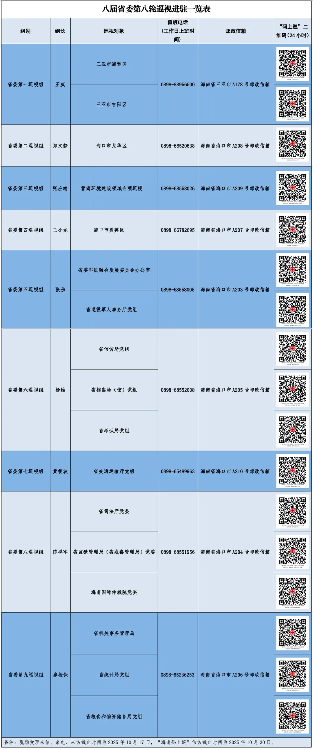 据悉,本轮巡视为期3个月,期间9个省委巡视组均设立专门值班电话、邮政信箱,并公布“海南码上巡”微信二维码,主要受理反映被巡视党组织领导班子及其成员、下一级党组织主要负责人和重要岗位领导干部问题的来信来电来访,重点是关于违反“六大纪律”以及巡视整改等方面的举报和反映。对其他与巡视工作无直接关系的个人诉求、涉法涉诉等信访问题,将按照分级负责、属地管理原则,转交有关单位办理。巡视组现场受理群众来信、来电、来访时间截止到2025年10月17日,“海南码上巡”信访截止时间为2025年10月30日。