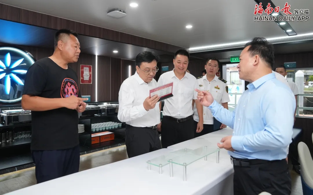 在位于海甸岛的东坡老码头,冯飞登上在码头停泊避风的“海上追光之旅”游船,检查游船安全设施配备,与值守船员沟通交流,了解国庆中秋假期运营准备情况。他指出,国庆中秋假期客流将迎来大幅增长,安全生产工作不容忽视。要更加注重细节管理,全面开展安全隐患排查,筑牢游船安全防线,护航游客安心之旅。要在做好安全生产工作的前提下,提升游客游览体验感,加大宣传推广力度,打造海口海洋旅游领域特色项目。