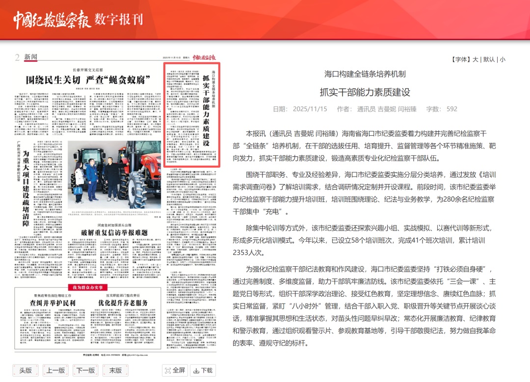 海南省海口市纪委监委着力构建并完善纪检监察干部“全链条”培养机制,在干部的选拔任用、培育提升、监督管理等各个环节精准施策、靶向发力,抓实干部能力素质建设,锻造高素质专业化纪检监察干部队伍。