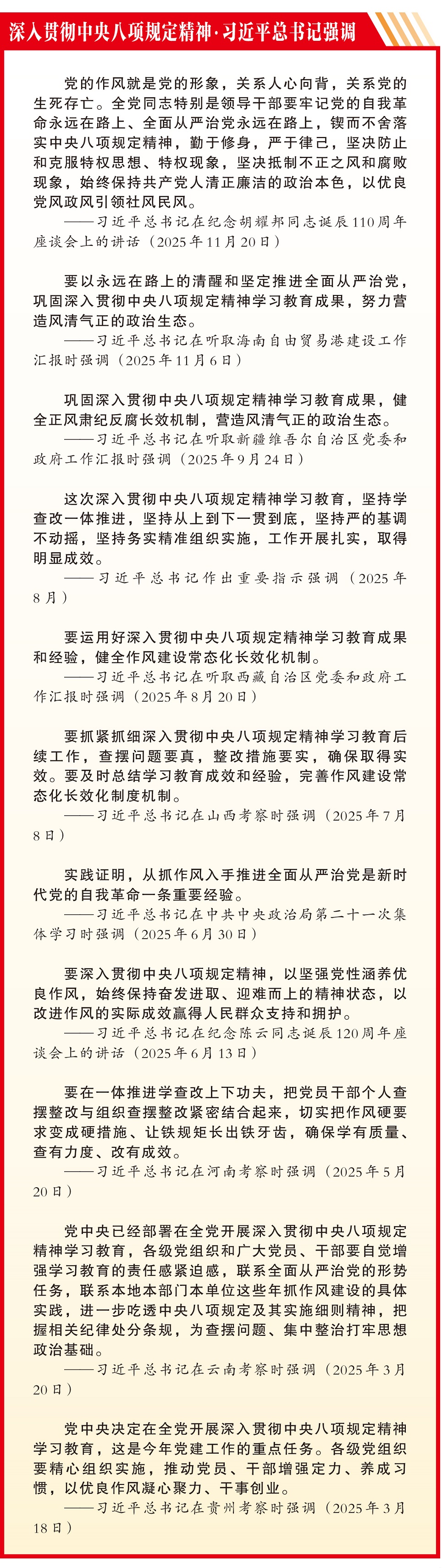 系统性的制度设计,构建政党治理的“中国样本”。在政党与制度的关系维度上,八项规定展现了制度建设不仅是约束行为的规范体系,更是塑造政党品格、引导组织进化的建构性力量,这一制度建构逻辑已得到国际社会认同;在政党与民众的关系维度上,八项规定通过具体要求将群众路线方法化、程序化为制度化的工作流程,构建起政党联系群众、回应民意的制度化通道;在政党与权力的关系维度上,八项规定通过严格的权力规范和监督机制,实现了对权力运行的精准管控,防止权力异化,这样的政治勇气为各国政党树立了典范。泰国泰中“一带一路”合作研究中心主任威伦·披差翁帕迪说,中国共产党秉持自我革命精神,生动展示了一个政党如何不断完善权力运行机制、维护人民利益和提升治理能力,这为世界各国应对日益复杂的未来挑战提供了宝贵的政治智慧。从中可以看出,中央八项规定精神所产生的影响已经超越了国界,为全球政治风清气朗与社会稳定进步注入了澎湃正能量。