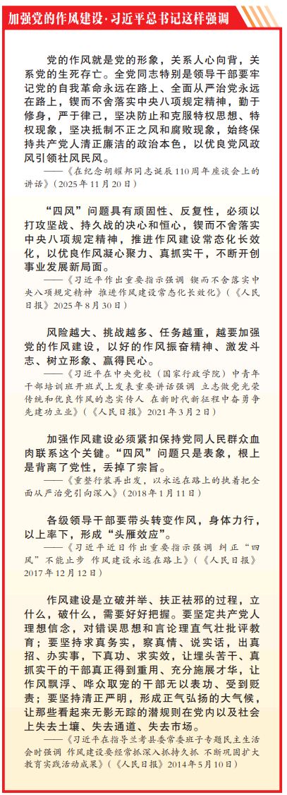 习近平总书记指出,“四风”问题具有顽固性、反复性,必须以打攻坚战、持久战的决心和恒心,锲而不舍落实中央八项规定精神,推进作风建设常态化长效化,以优良作风凝心聚力、真抓实干,不断开创事业发展新局面。要增强作风教育针对性实效性,突出新提拔干部、年轻干部、关键岗位干部的教育引导。要建立健全经常性发现问题、解决问题机制,动真格整改整治,持续释放一抓到底、一严到底的强烈信号。要强化监督执纪,抓实党组织日常监督,有效发挥群众监督作用,对顶风违纪的速查严处。要落实作风建设政治责任,严负其责、严管所辖,以铁规矩锻造好作风,推动党员干部干事创业、担当作为、为民造福。