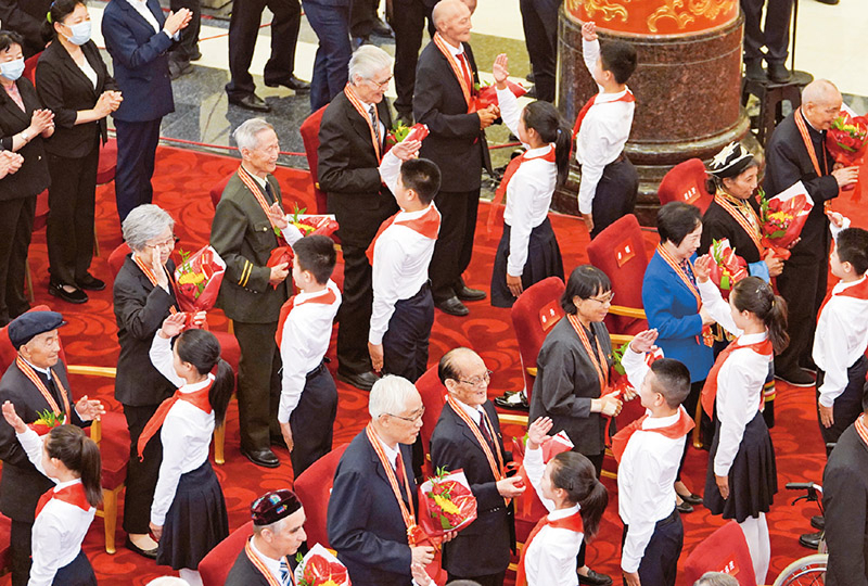 100多年来,一代又一代中国共产党人,为赢得民族独立和人民解放、实现国家富强和人民幸福,前仆后继、浴血奋战,艰苦奋斗、无私奉献。在他们身上,生动体现了中国共产党人坚定信念、践行宗旨、拼搏奉献、廉洁奉公的高尚品质和崇高精神。图为2021年6月29日,庆祝中国共产党成立100周年“七一勋章”颁授仪式上,少先队员向勋章获得者献花,敬礼致意。 新华社记者 高洁/摄