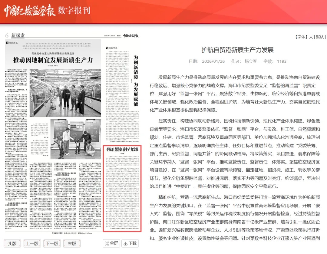 《中国纪检监察报》刊发杨会春署名文章:护航自贸港新质生产力发展