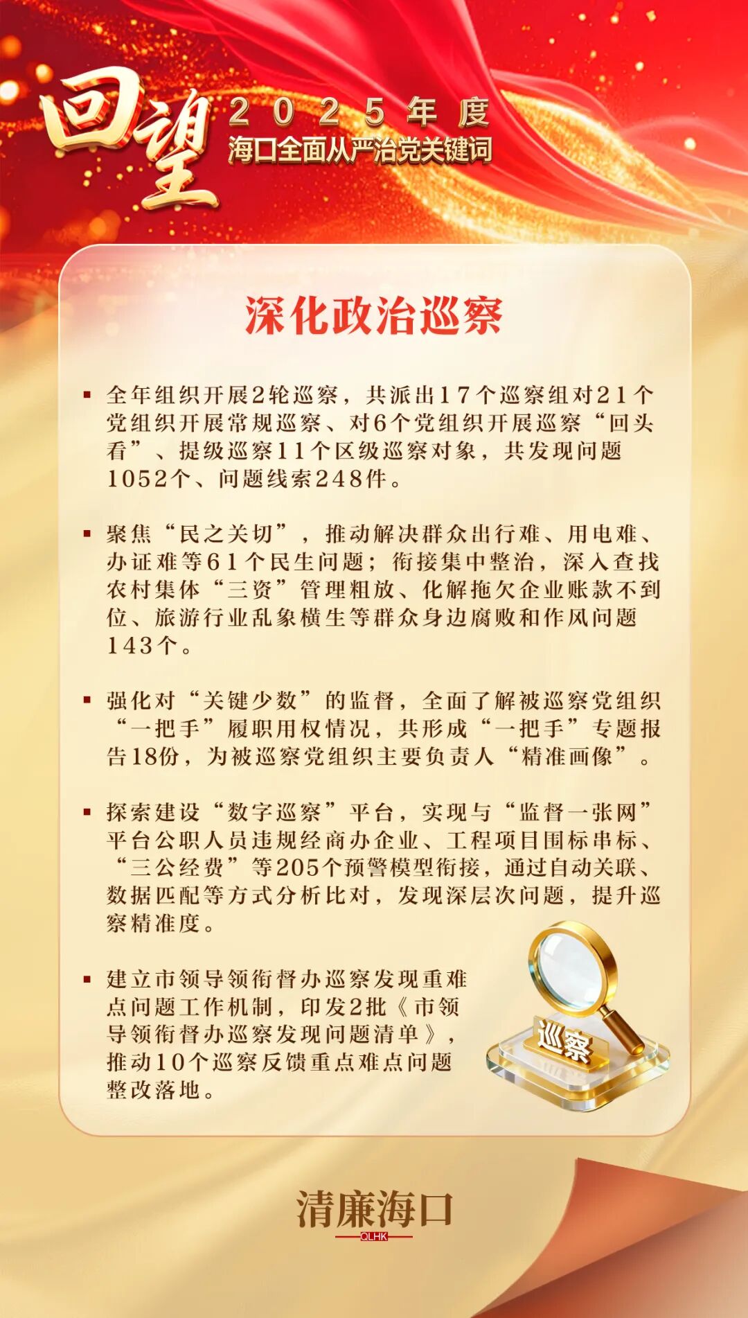 2025年,海口坚持围绕中心、服务大局,以“改革与发展”为主题,把贯彻落实习近平总书记关于海南工作的系列重要讲话和指示批示精神、推动全岛封关运作任务落实、自贸港核心引领区和“六个之城”建设,以及深入贯彻中央八项规定精神学习教育等情况作为巡察监督的重中之重,深入查找政治偏差、重大风险、突出问题,扎实推进十四届市委巡察全覆盖。