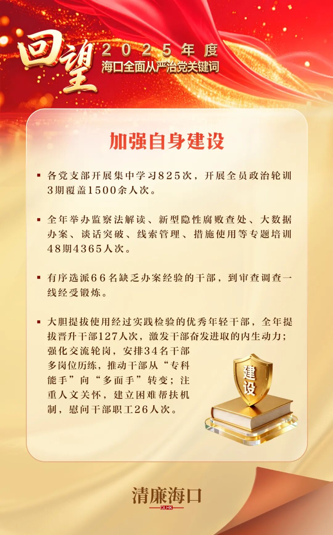 2025年,海口市纪委监委深入贯彻落实习近平总书记关于党的自我革命的重要思想,把纪检监察队伍建设作为基础工程、长期工程,从严从实推进干部队伍政治建设、能力建设、作风建设和廉洁建设,着力锻造忠诚干净担当、敢于善于斗争的纪检监察铁军,为坚决打赢反腐败斗争攻坚战持久战总体战提供坚强保障。