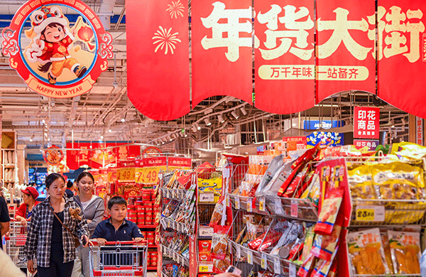 超市内浓郁的年味扑面而来,红灯笼、中国结、春联福字……琳琅满目的各类商品将年货大街装点得熠熠生辉,吸引了大批市民前来选购。(海南省海口市纪委监委供 康登淋 摄)