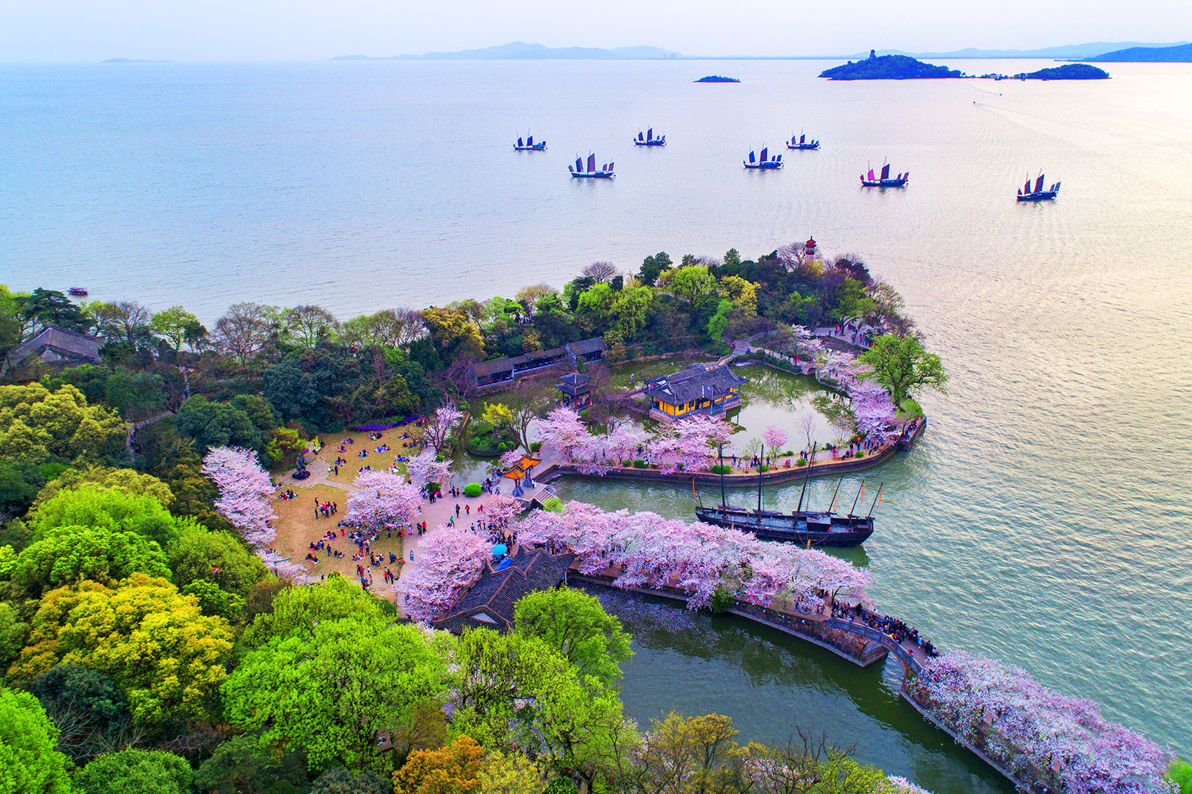 春染太湖,樱红水碧。江苏无锡鼋头渚,樱花与太湖水相映成趣,如入画中。