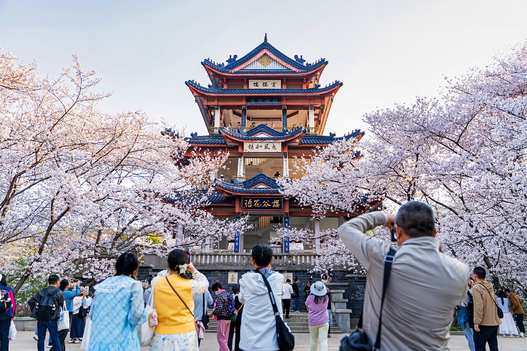 太湖鼋头渚樱花谷内,赏樱楼前,游客驻足留影,定格春日美好瞬间。