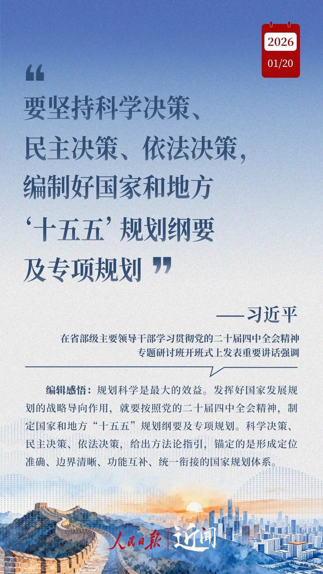 “十五五”开局之年的“开年第一课”,主题是“学习贯彻党的二十届四中全会精神”。习近平总书记在省部级主要领导干部学习贯彻党的二十届四中全会精神专题研讨班开班式上的重要讲话,既彰显战略眼光的宏阔,也划明接续奋斗的重点。