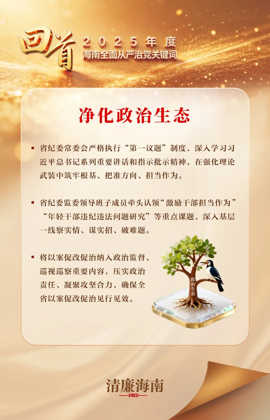 2025年,省纪委监委始终把严肃党内政治生活、净化党内政治生态摆在更加突出的位置来抓,深学细悟笃行习近平新时代中国特色社会主义思想,以彻底的自我革命精神协助省委净化海南政治生态,推动全省政治生态持续向好、日益充盈,为海南自由贸易港建设和现代化强省建设提供了坚强保障。
