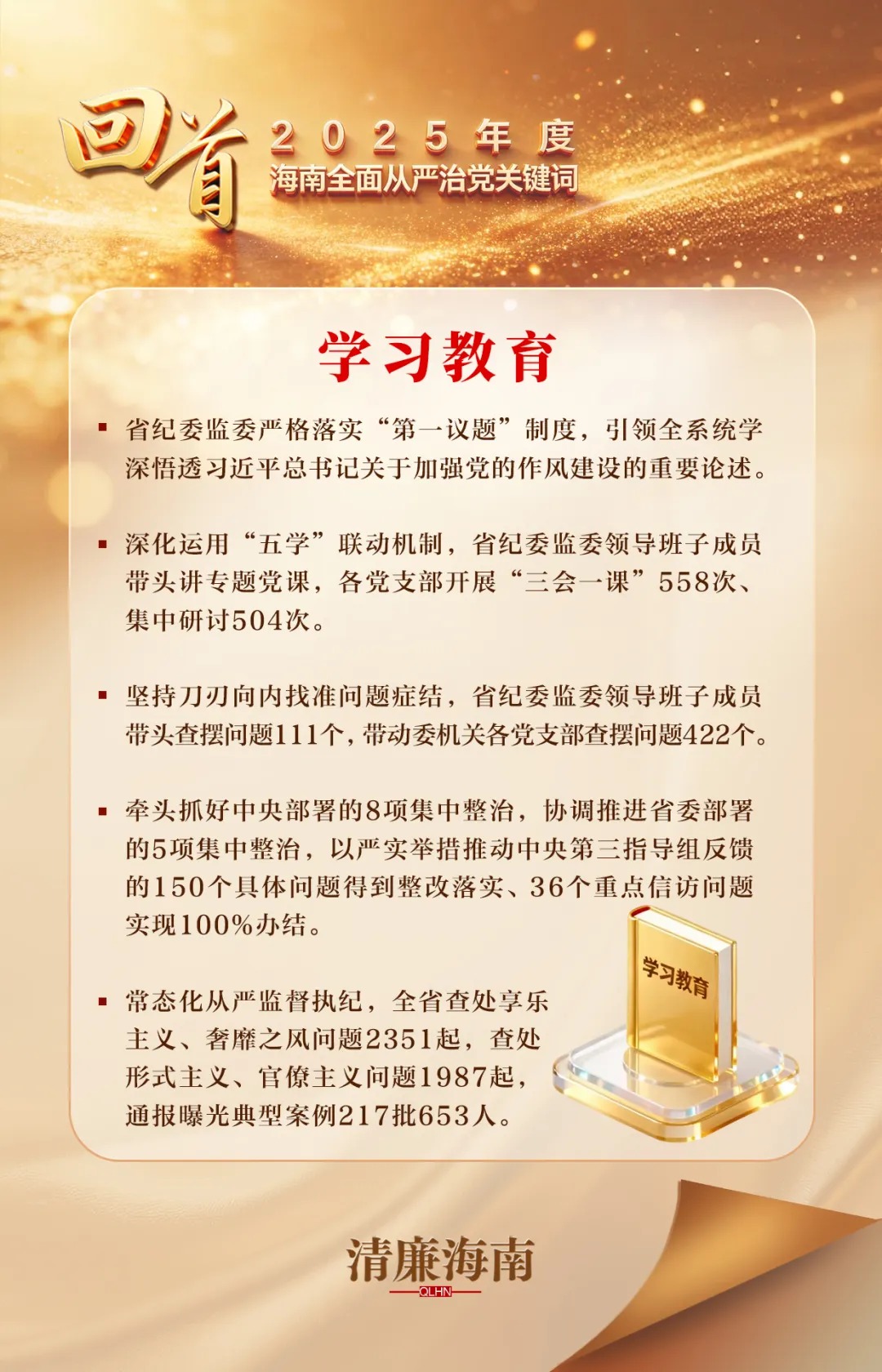 过去一年,省委全面学习贯彻习近平总书记关于党的自我革命的重要思想,以打攻坚战、持久战的决心和恒心,锲而不舍落实中央八项规定精神,推进作风建设常态化长效化,以高度的政治责任感不折不扣抓好中央巡视反馈问题整改、以案促改促治,把整改成效转化为推动海南全面深化改革开放和高质量发展的强大动力,奋力谱写中国式现代化海南篇章。在中央纪委国家监委和省委坚强领导下,全省各级纪检监察机关坚定拥护“两个确立”、坚决做到“两个维护”,忠诚履职尽责、积极担当作为,扎实开展深入贯彻中央八项规定精神学习教育,持续强化政治监督,坚定不移正风肃纪反腐,锤炼锻造过硬铁军,以纪检监察工作高质量发展新成效,为海南自由贸易港封关运作保驾护航。1月31日至2月1日,省纪委八届五次全会将在海口召开。省纪委监委梳理2025年海南全面从严治党关键词,回顾这一年全面从严治党工作的主要做法及亮点成效。
