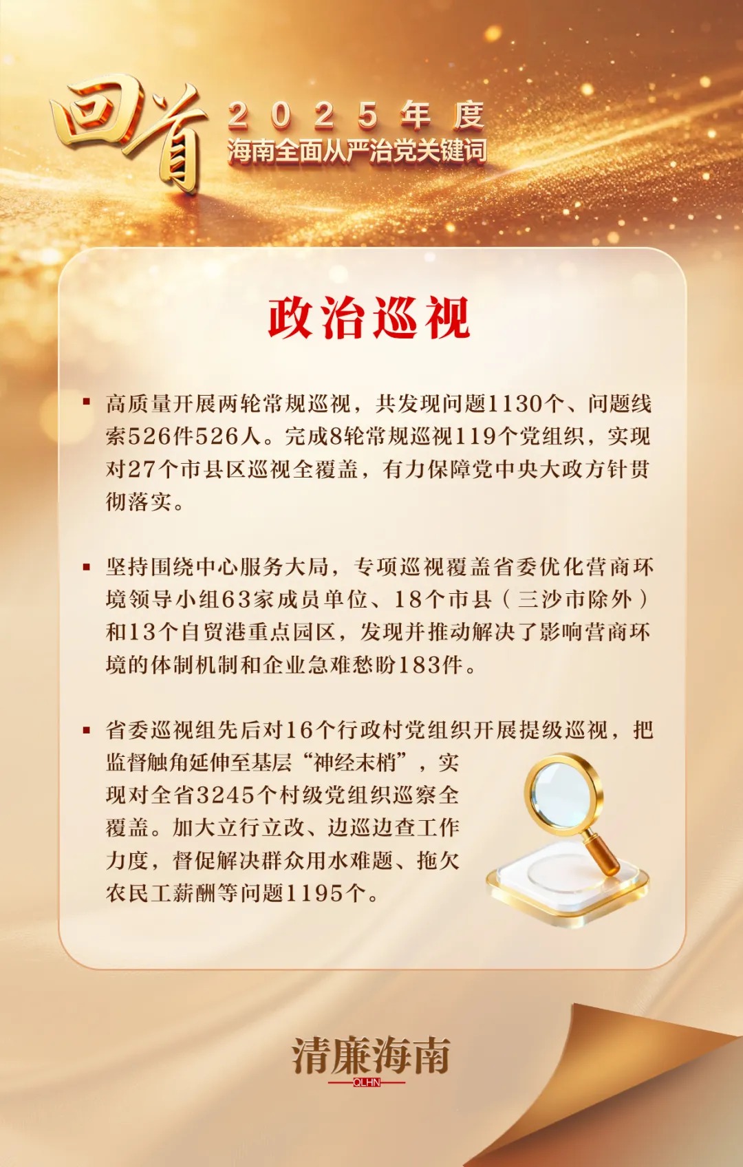 2025年,省委紧紧围绕“两个维护”重大政治责任,将政治巡视与海南自贸港建设中心任务深度融合,重点聚焦营商环境、公共工程、基层治理等关键领域,高质量开展两轮常规巡视,共发现问题1130个、问题线索526件526人。完成8轮常规巡视119个党组织,实现对27个市县区巡视全覆盖,有力保障党中央大政方针贯彻落实。